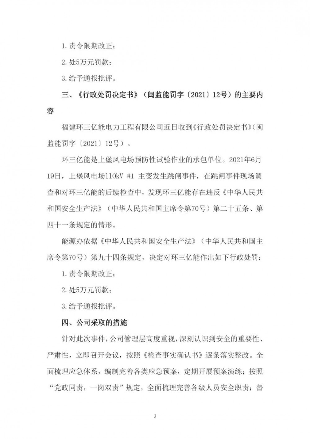 《公告》顯示,2021年6月19日,因上堡風(fēng)電場110kV#1主變發(fā)生跳閘事件,在跳閘事件現(xiàn)場調(diào)查和對閩東電力的后續(xù)檢查中,發(fā)現(xiàn)閩東電力、蕉城閩電、環(huán)三億能均存在違反相關(guān)法律條文的情況,分別處以10萬元、5萬元、5萬元的罰款。