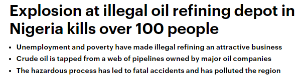 非法原油煉制產業(yè)有著致命后果,這些原油通常都是從大型石油業(yè)者們縱橫交錯的管線接取, 在簡陋儲槽煉制成油品. 程序復雜而危險, 已經造成了許多致命意外事故,。