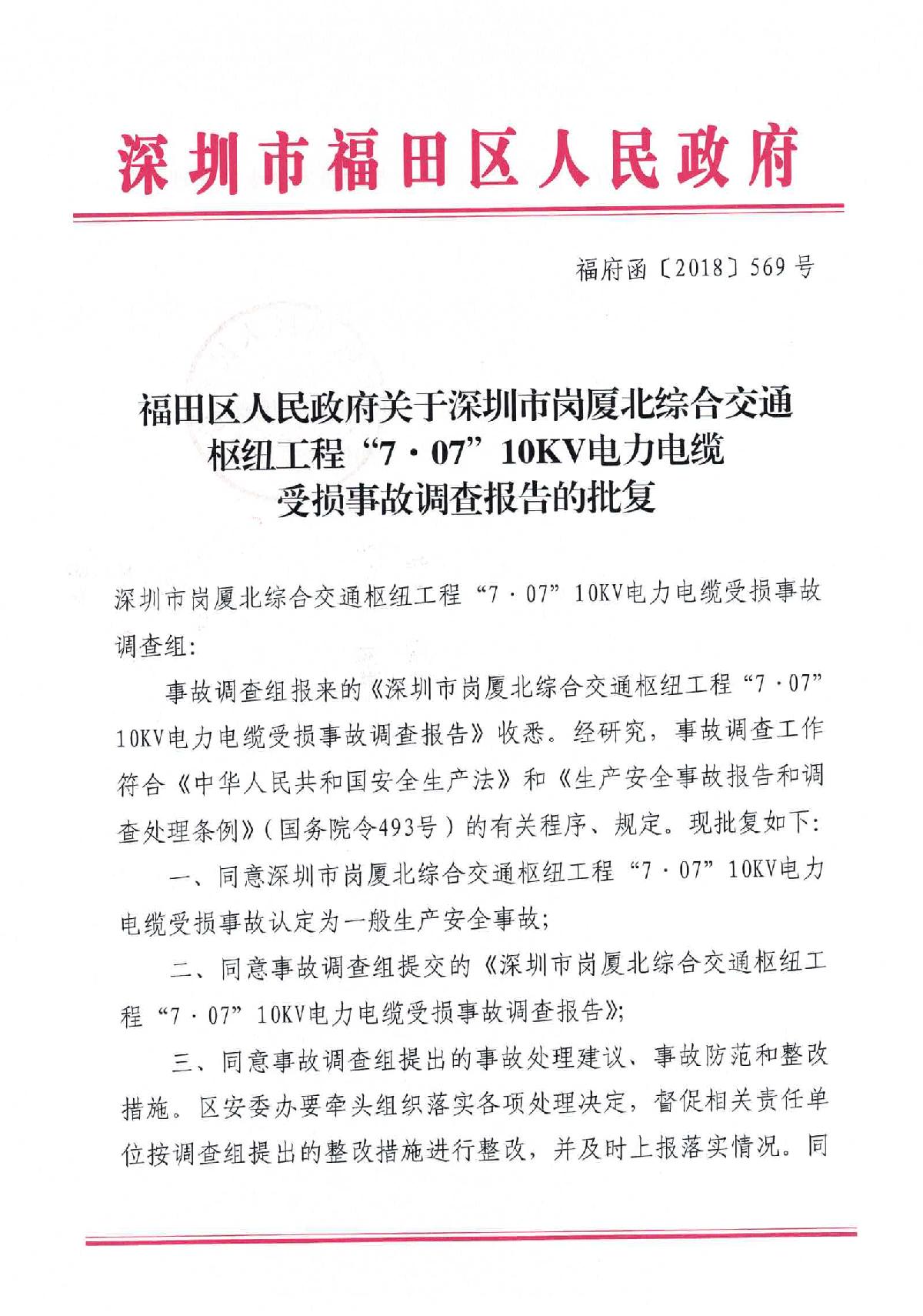 福田區(qū)人民政府關于深圳市城市軌道交通6號線二期主體工程6111標“7.05”10kv電力電纜受損事故調(diào)查報告