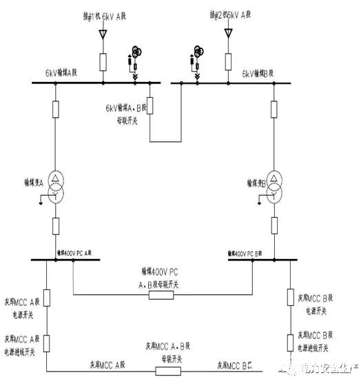 輸煤系統(tǒng)6kV電源設(shè)計(jì)A、B兩段母線,單母線分段運(yùn)行,母聯(lián)開關(guān)熱備用。輸煤配電室內(nèi)布置兩臺(tái)400V輸煤廠用變壓器,高壓側(cè)分別接6kV電源母線A段、B段,低壓側(cè)接輸煤400V母線A段、B段,兩段分段運(yùn)行,母聯(lián)開關(guān)熱備用。