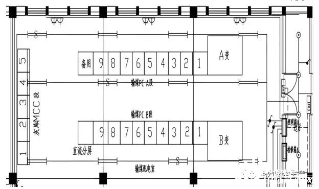 在輸煤配電室內(nèi),同時(shí)設(shè)計(jì)布置灰?guī)霢、B兩段MCC。兩段MCC各帶一個(gè)浪涌保護(hù)器,分別設(shè)置在兩段MCC進(jìn)線開關(guān)側(cè)。400V灰?guī)霱CC開關(guān)柜為MNS型開關(guān)柜。灰?guī)斓裙孟到y(tǒng)的建設(shè)為A標(biāo)段的工作內(nèi)容,天津公司負(fù)責(zé)灰?guī)霱CC安裝,天津公司分包給中某建設(shè)實(shí)施。輸煤系統(tǒng)和灰?guī)祀娫唇泳€圖見圖一;配電室俯視示意圖見圖二。