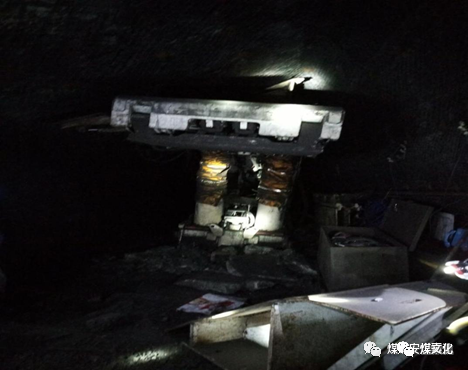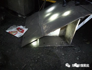 事故地點(diǎn)位于Z14-2W01綜采工作面回風(fēng)順槽,距工作面23.5m超前支架處。 事故發(fā)生地點(diǎn)的超前支架已卸載,頂梁距離頂板最小距離0.7m,最大距離1.6m,超前支架底座前2.5m處有從支架頂部滑落的三角形斜梁,長(zhǎng)1.82m,寬1.5m,高0.7m,重約900kg,三角形斜梁底座有焊印,支架頂梁上無(wú)螺栓孔,支架與三角形斜梁靠上幫處有一鐵質(zhì)工具箱(見(jiàn)圖2);Z14-2W01綜采工作面存在19.1㎡的空頂范圍。其余詳見(jiàn)《現(xiàn)場(chǎng)勘查報(bào)告》。