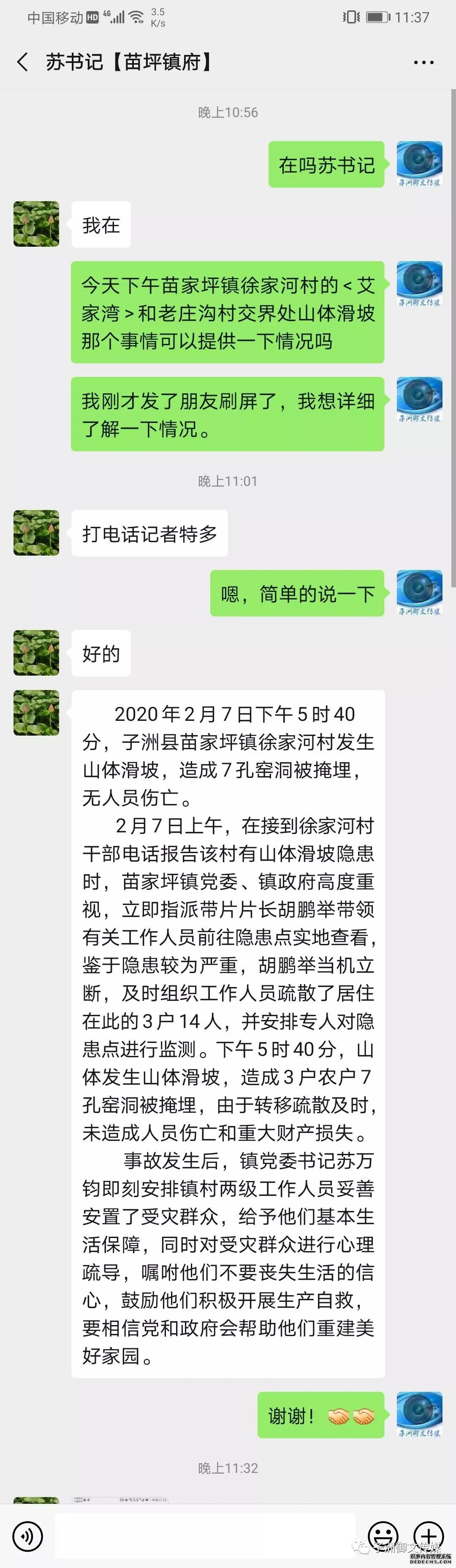 2月7日上午,在接到徐家河村干部電話報告該村有山體滑坡隱患時,苗家坪鎮(zhèn)黨委、鎮(zhèn)政府高度重視,立即指派帶片片長胡鵬舉帶領有關工作人員前往隱患點實地查看,鑒于隱患較為嚴重,胡鵬舉當機立斷,及時組織工作人員疏散了居住在此的3戶14人,并安排專人對隱患點進行監(jiān)測。下午5時40分,山體發(fā)生山體滑坡,造成3戶農(nóng)戶7孔窯洞被掩埋,由于轉移疏散及時,未造成人員傷亡和重大財產(chǎn)損失。