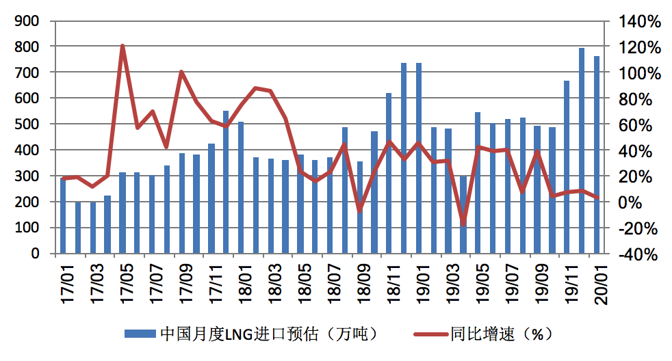 新華能源E-gas數(shù)據(jù)平臺(tái)的預(yù)測結(jié)果顯示,2020年1月份,中國LNG進(jìn)口量預(yù)計(jì)為763萬噸,較去年同期增長3.4%,較2019年12月減少3.9%。