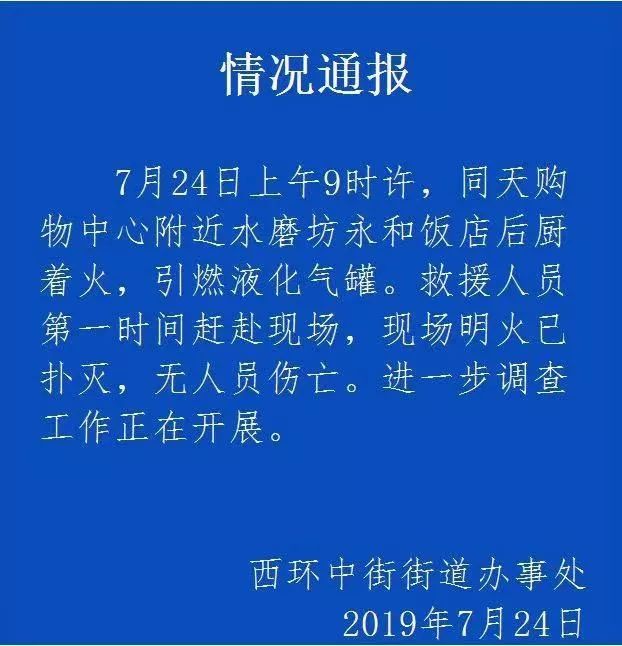 7月24日上午9時許,同天購物中心附近水磨坊永和飯店后廚著火,引燃液化氣罐。救援人員第一時間趕赴現(xiàn)場,現(xiàn)場明火已撲滅,無人員傷亡。進一步調(diào)查工作正在開展。
