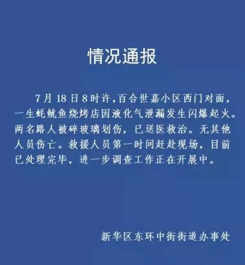 據(jù)通報(bào)顯示,7月18日上午8時(shí)左右,百合世嘉小區(qū)西門對(duì)面,一生蠔魷魚燒烤店因液化氣泄漏發(fā)生閃爆起火。