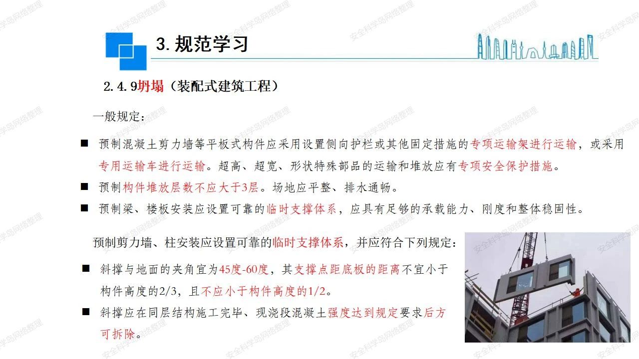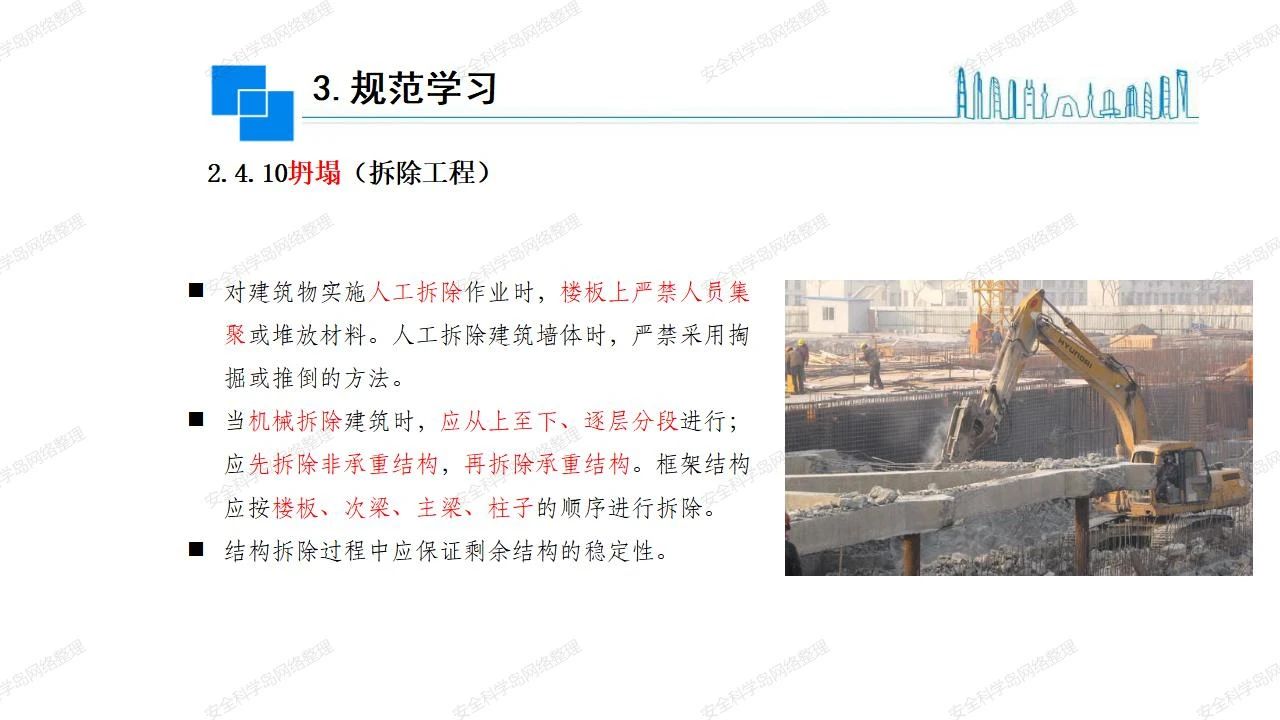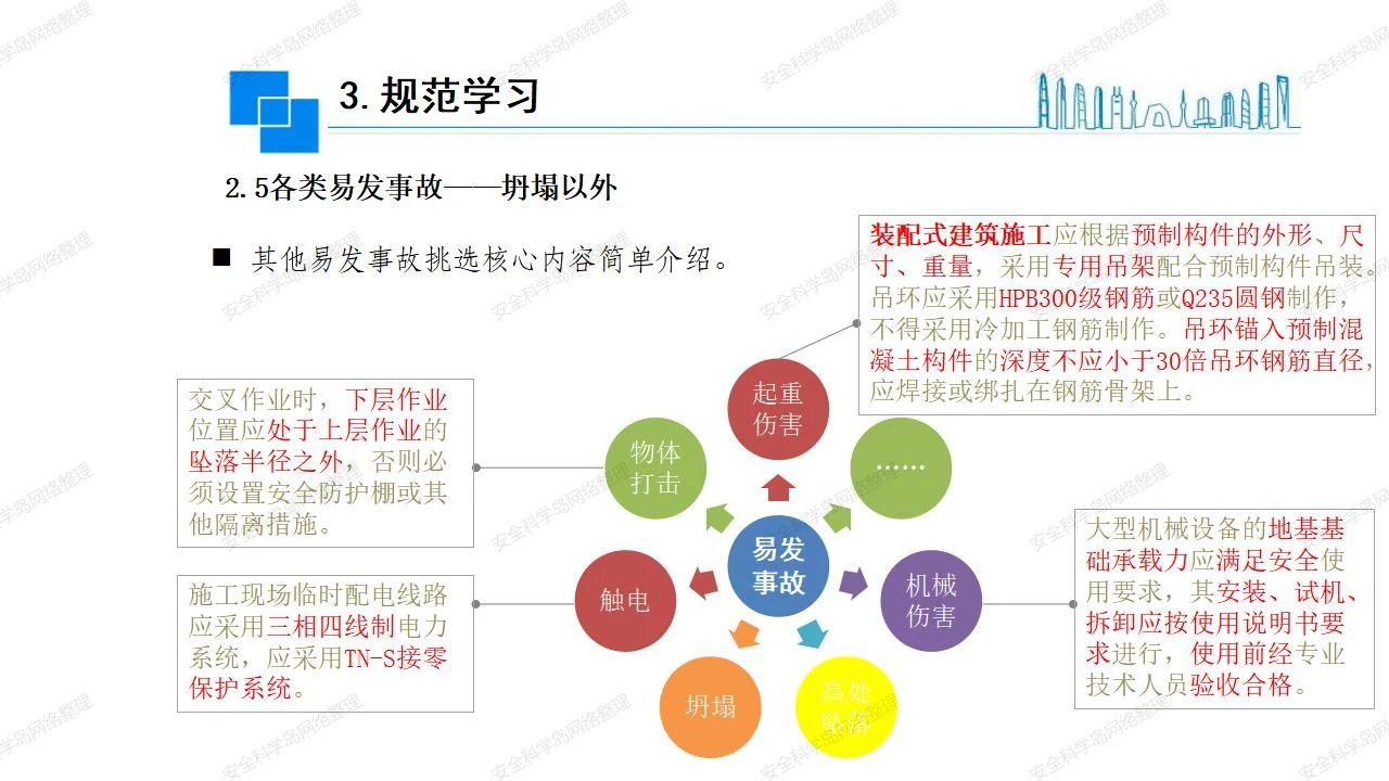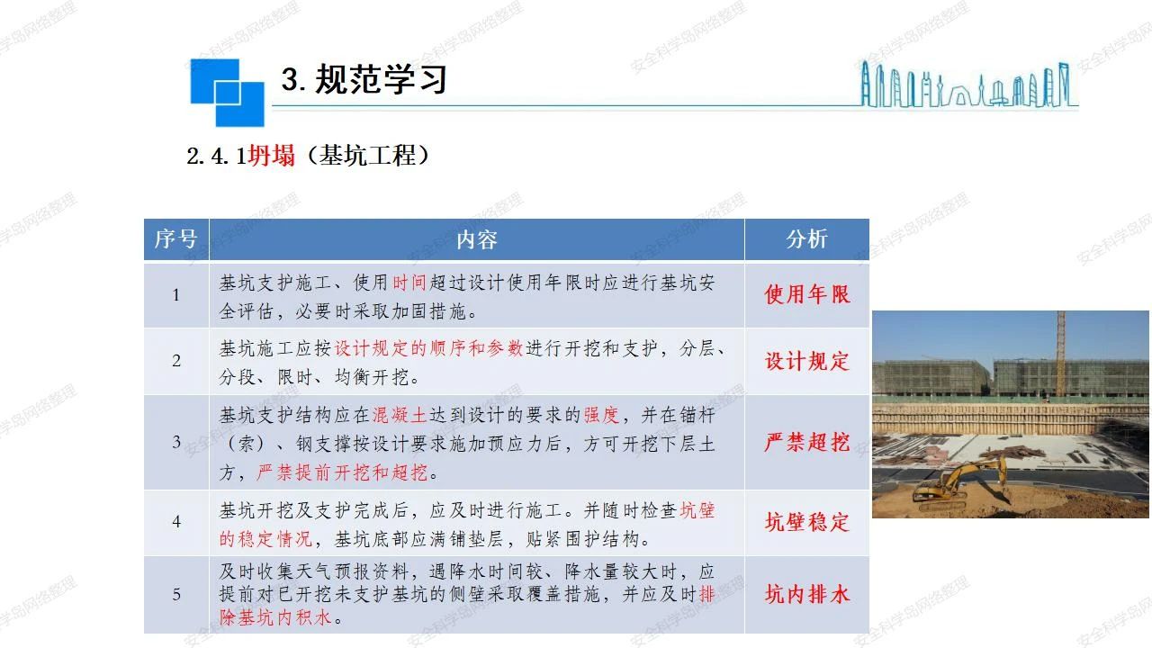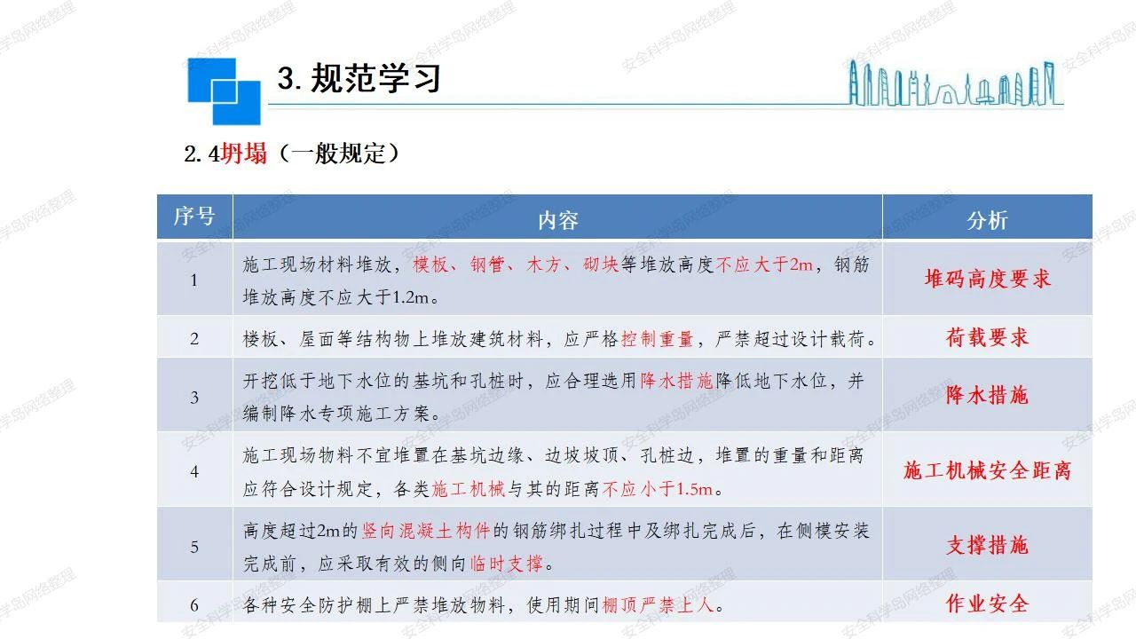 那么,坍塌事故發(fā)生的原因何在? (1)工程結(jié)構(gòu)設(shè)計(jì)不合理或計(jì)算失誤。 (2)施工前沒(méi)有編制切實(shí)可行的施工組織設(shè)計(jì)和專(zhuān)項(xiàng)施工方案,未做具體技術(shù)安全措施交底,特定施工項(xiàng)目未經(jīng)專(zhuān)家評(píng)審論證。 (3)腳手架、模板支撐、起重設(shè)備結(jié)構(gòu)設(shè)計(jì)不合理或計(jì)算失誤。 (4)建筑物結(jié)構(gòu)質(zhì)量低劣,安全性能差,地基不穩(wěn)定,不均勻沉降。 (5)建筑物結(jié)構(gòu)支撐連接(焊接)不牢固,超載、外力沖擊或嚴(yán)重偏心載荷造成失穩(wěn)等。 (6)腳手架及高大模板支架架體結(jié)構(gòu)不符合設(shè)計(jì)與規(guī)范要求,整體安全穩(wěn)定性差、超載或嚴(yán)重偏心荷載,遇外力沖擊或振動(dòng),不按程序拆除架體等因素造成失穩(wěn)等。 (7)基坑、土石方挖土?xí)r土壁不按規(guī)定留設(shè)邊坡(甚至負(fù)坡度),缺乏支護(hù)或支護(hù)不良,土質(zhì)不良或出現(xiàn)地下水、地表水的滲透,土壁經(jīng)不起重載側(cè)壓力或遇外力振動(dòng)、沖擊等因素造成土壁失穩(wěn)滑坡坍塌。 (8)起重設(shè)備技術(shù)安全性能差,結(jié)構(gòu)強(qiáng)度不夠,安全防護(hù)裝置不完善,垂直起重機(jī)與建筑物拉結(jié)差,出現(xiàn)超載、碰撞、升降過(guò)度或違章操作等原因,造成起重設(shè)備倒塌。 (9)現(xiàn)場(chǎng)作業(yè)環(huán)境不良,安全防護(hù)設(shè)施缺乏。 (10)施工現(xiàn)場(chǎng)管理松弛,各項(xiàng)質(zhì)量、安全管理制度流于形式。 (11)片面追求經(jīng)濟(jì)利益,偷工減料,施工質(zhì)量差。 (12)施工隊(duì)伍素質(zhì)差,不執(zhí)行法規(guī)、標(biāo)準(zhǔn),違章指揮、違章作業(yè),思想上存在盲目性、冒險(xiǎn)性、隨意性。 如何預(yù)防坍塌事故? (1)根據(jù)設(shè)計(jì)與規(guī)范要求,認(rèn)真編制施工組織設(shè)計(jì)和專(zhuān)項(xiàng)施工技術(shù)方案、應(yīng)急預(yù)案,做好特定施工項(xiàng)目專(zhuān)家評(píng)審論證及技術(shù)安全交底工作。 (2)支架、腳手架等搭設(shè)完成后應(yīng)組織相關(guān)部門(mén)驗(yàn)收。支架還應(yīng)按方案要求進(jìn)行堆載預(yù)壓。 (3)嚴(yán)格控制模板支架、腳手架等承受的荷載,模板、腳手架及其支撐體系的施工荷載應(yīng)做到均勻分布,并不得超過(guò)設(shè)計(jì)要求。嚴(yán)禁超載、對(duì)構(gòu)筑物進(jìn)行外力沖擊或偏心載荷。 (4)基坑、土石方挖土?xí)r土壁按規(guī)定留設(shè)邊坡,嚴(yán)格按照設(shè)計(jì)坡度進(jìn)行放坡開(kāi)挖,進(jìn)行有效支護(hù)和排水,并設(shè)置專(zhuān)人對(duì)邊坡穩(wěn)定性進(jìn)行檢測(cè)?;討?yīng)基坑頂邊緣1m范圍內(nèi)禁止堆放材料。 (5)加強(qiáng)起重設(shè)備的采購(gòu)管理,嚴(yán)禁使用不合格的起重設(shè)備,并定期進(jìn)行檢測(cè),確保各項(xiàng)性能和安全防護(hù)裝置良好;加強(qiáng)起重設(shè)備的安裝、拆除管理;加強(qiáng)起重設(shè)備的使用管理,嚴(yán)禁超載、碰撞或違章操作;加強(qiáng)對(duì)起重設(shè)備操作人員、指揮人員、安拆人員的安全教育培訓(xùn),考核合格后持證上崗。 (6)加強(qiáng)施工現(xiàn)場(chǎng)管理,設(shè)置有效安全防護(hù)設(shè)施。 (7)加強(qiáng)對(duì)從業(yè)人員的培訓(xùn)教育,提高隊(duì)伍素質(zhì),強(qiáng)化質(zhì)量、安全意識(shí)。 (8)強(qiáng)化工程質(zhì)量報(bào)驗(yàn)和檢驗(yàn)、簽證制度,不經(jīng)檢驗(yàn)合格,不準(zhǔn)進(jìn)行下道工序施工。 (9)發(fā)現(xiàn)坍塌事故的險(xiǎn)情,要認(rèn)真分析原因,積極研究提出排除隱患的整改措施,并監(jiān)督執(zhí)行。