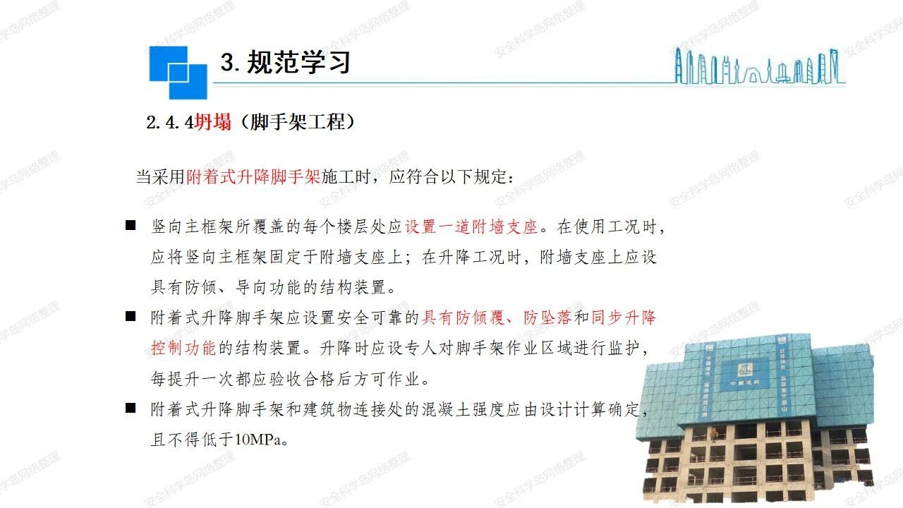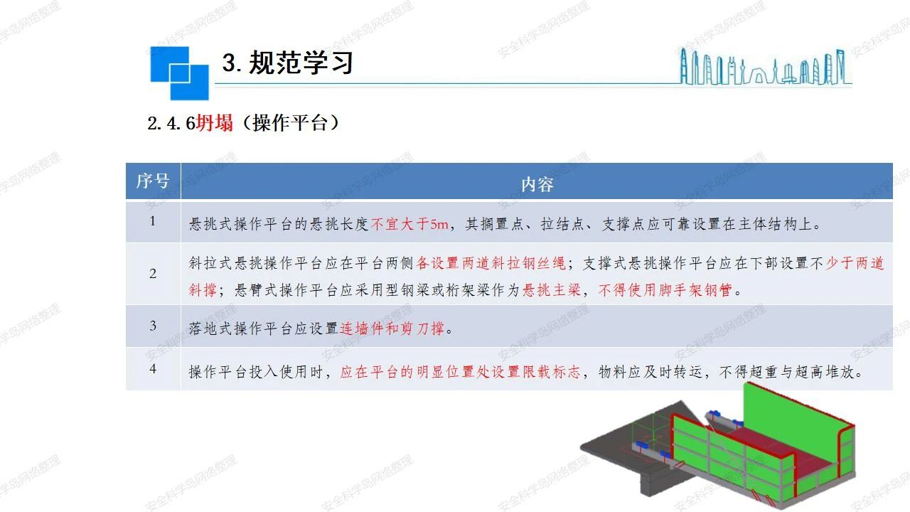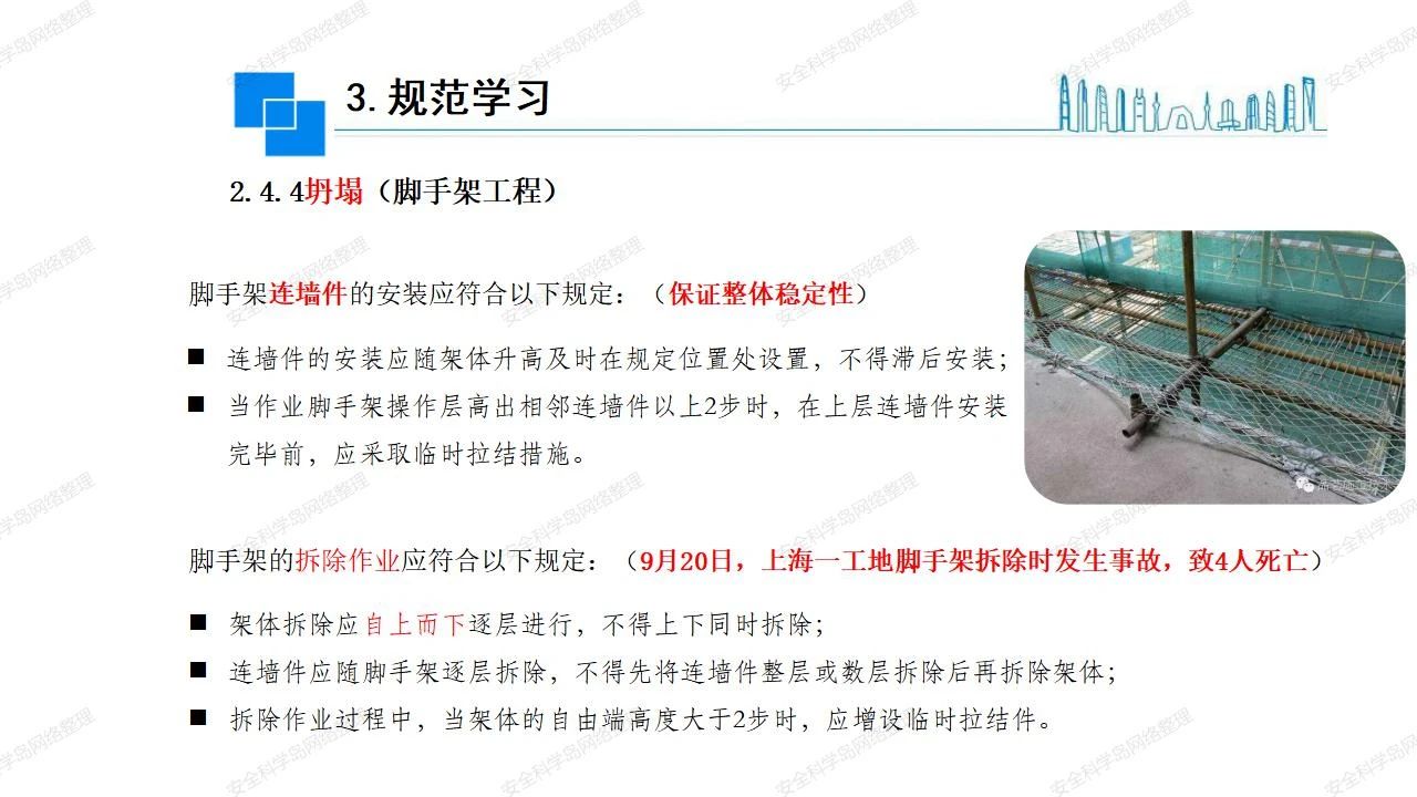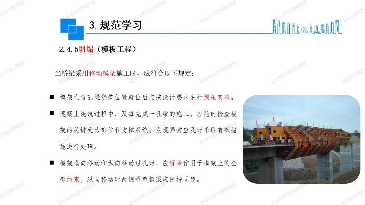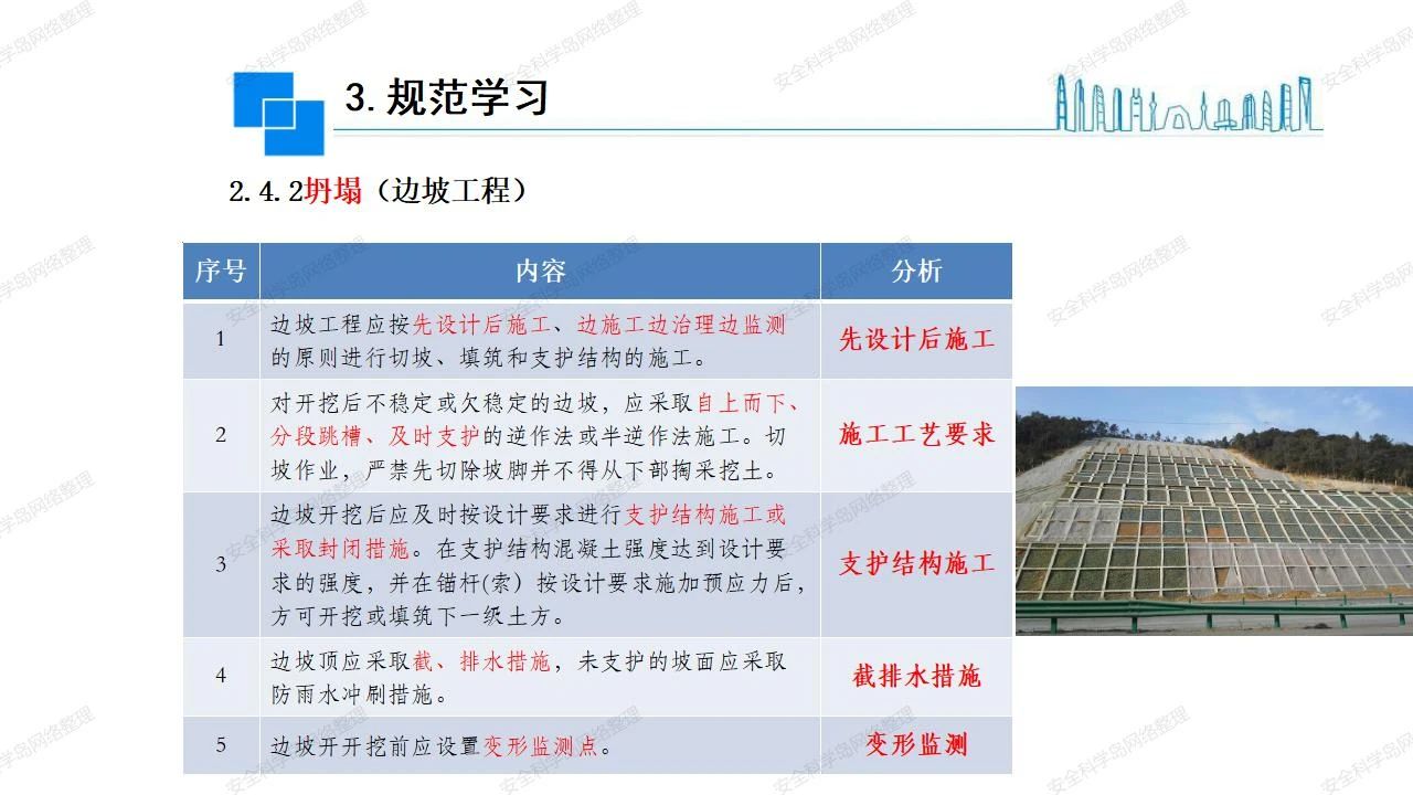 那么,坍塌事故發(fā)生的原因何在? (1)工程結(jié)構(gòu)設(shè)計(jì)不合理或計(jì)算失誤。 (2)施工前沒(méi)有編制切實(shí)可行的施工組織設(shè)計(jì)和專(zhuān)項(xiàng)施工方案,未做具體技術(shù)安全措施交底,特定施工項(xiàng)目未經(jīng)專(zhuān)家評(píng)審論證。 (3)腳手架、模板支撐、起重設(shè)備結(jié)構(gòu)設(shè)計(jì)不合理或計(jì)算失誤。 (4)建筑物結(jié)構(gòu)質(zhì)量低劣,安全性能差,地基不穩(wěn)定,不均勻沉降。 (5)建筑物結(jié)構(gòu)支撐連接(焊接)不牢固,超載、外力沖擊或嚴(yán)重偏心載荷造成失穩(wěn)等。 (6)腳手架及高大模板支架架體結(jié)構(gòu)不符合設(shè)計(jì)與規(guī)范要求,整體安全穩(wěn)定性差、超載或嚴(yán)重偏心荷載,遇外力沖擊或振動(dòng),不按程序拆除架體等因素造成失穩(wěn)等。 (7)基坑、土石方挖土?xí)r土壁不按規(guī)定留設(shè)邊坡(甚至負(fù)坡度),缺乏支護(hù)或支護(hù)不良,土質(zhì)不良或出現(xiàn)地下水、地表水的滲透,土壁經(jīng)不起重載側(cè)壓力或遇外力振動(dòng)、沖擊等因素造成土壁失穩(wěn)滑坡坍塌。 (8)起重設(shè)備技術(shù)安全性能差,結(jié)構(gòu)強(qiáng)度不夠,安全防護(hù)裝置不完善,垂直起重機(jī)與建筑物拉結(jié)差,出現(xiàn)超載、碰撞、升降過(guò)度或違章操作等原因,造成起重設(shè)備倒塌。 (9)現(xiàn)場(chǎng)作業(yè)環(huán)境不良,安全防護(hù)設(shè)施缺乏。 (10)施工現(xiàn)場(chǎng)管理松弛,各項(xiàng)質(zhì)量、安全管理制度流于形式。 (11)片面追求經(jīng)濟(jì)利益,偷工減料,施工質(zhì)量差。 (12)施工隊(duì)伍素質(zhì)差,不執(zhí)行法規(guī)、標(biāo)準(zhǔn),違章指揮、違章作業(yè),思想上存在盲目性、冒險(xiǎn)性、隨意性。 如何預(yù)防坍塌事故? (1)根據(jù)設(shè)計(jì)與規(guī)范要求,認(rèn)真編制施工組織設(shè)計(jì)和專(zhuān)項(xiàng)施工技術(shù)方案、應(yīng)急預(yù)案,做好特定施工項(xiàng)目專(zhuān)家評(píng)審論證及技術(shù)安全交底工作。 (2)支架、腳手架等搭設(shè)完成后應(yīng)組織相關(guān)部門(mén)驗(yàn)收。支架還應(yīng)按方案要求進(jìn)行堆載預(yù)壓。 (3)嚴(yán)格控制模板支架、腳手架等承受的荷載,模板、腳手架及其支撐體系的施工荷載應(yīng)做到均勻分布,并不得超過(guò)設(shè)計(jì)要求。嚴(yán)禁超載、對(duì)構(gòu)筑物進(jìn)行外力沖擊或偏心載荷。 (4)基坑、土石方挖土?xí)r土壁按規(guī)定留設(shè)邊坡,嚴(yán)格按照設(shè)計(jì)坡度進(jìn)行放坡開(kāi)挖,進(jìn)行有效支護(hù)和排水,并設(shè)置專(zhuān)人對(duì)邊坡穩(wěn)定性進(jìn)行檢測(cè)?;討?yīng)基坑頂邊緣1m范圍內(nèi)禁止堆放材料。 (5)加強(qiáng)起重設(shè)備的采購(gòu)管理,嚴(yán)禁使用不合格的起重設(shè)備,并定期進(jìn)行檢測(cè),確保各項(xiàng)性能和安全防護(hù)裝置良好;加強(qiáng)起重設(shè)備的安裝、拆除管理;加強(qiáng)起重設(shè)備的使用管理,嚴(yán)禁超載、碰撞或違章操作;加強(qiáng)對(duì)起重設(shè)備操作人員、指揮人員、安拆人員的安全教育培訓(xùn),考核合格后持證上崗。 (6)加強(qiáng)施工現(xiàn)場(chǎng)管理,設(shè)置有效安全防護(hù)設(shè)施。 (7)加強(qiáng)對(duì)從業(yè)人員的培訓(xùn)教育,提高隊(duì)伍素質(zhì),強(qiáng)化質(zhì)量、安全意識(shí)。 (8)強(qiáng)化工程質(zhì)量報(bào)驗(yàn)和檢驗(yàn)、簽證制度,不經(jīng)檢驗(yàn)合格,不準(zhǔn)進(jìn)行下道工序施工。 (9)發(fā)現(xiàn)坍塌事故的險(xiǎn)情,要認(rèn)真分析原因,積極研究提出排除隱患的整改措施,并監(jiān)督執(zhí)行。