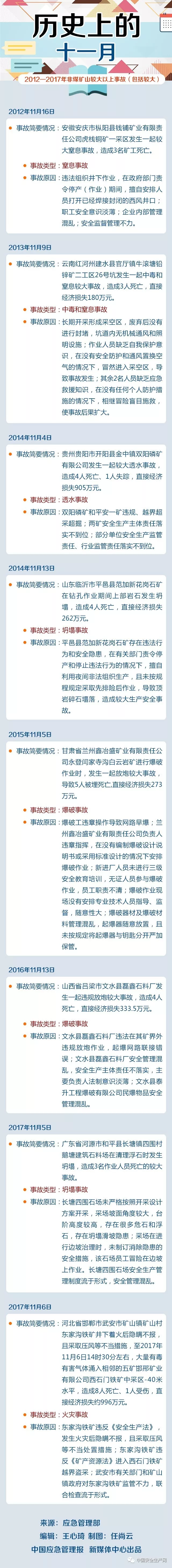 據(jù)不完全統(tǒng)計,2013年-2017年11月非煤礦山發(fā)生較大以上事故(包括較大)8起,中毒和窒息、坍塌、爆破三類事故多發(fā)!