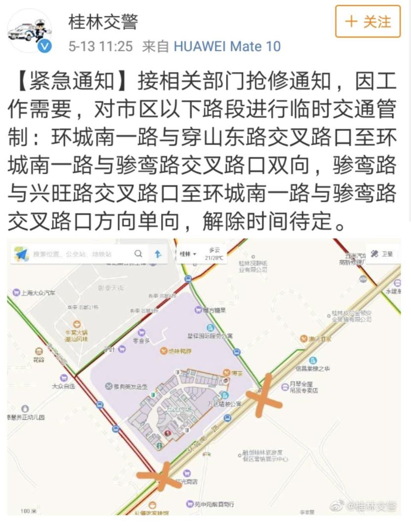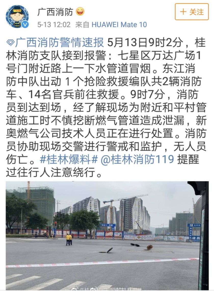 中午12時,@廣西消防官微發(fā)布了一警情速報:5月13日9時2分,桂林消防支隊接到報警:七星區(qū)萬達(dá)廣場1號門附近路上一下水管道冒煙。9時7分,消防員到達(dá)到場,經(jīng)了解現(xiàn)場為附近和平村管道施工時不慎挖斷燃?xì)夤艿涝斐尚孤?新奧燃?xì)夤炯夹g(shù)人員正在進(jìn)行處置。消防員協(xié)助現(xiàn)場交警進(jìn)行警戒和監(jiān)護(hù),無人員傷亡。