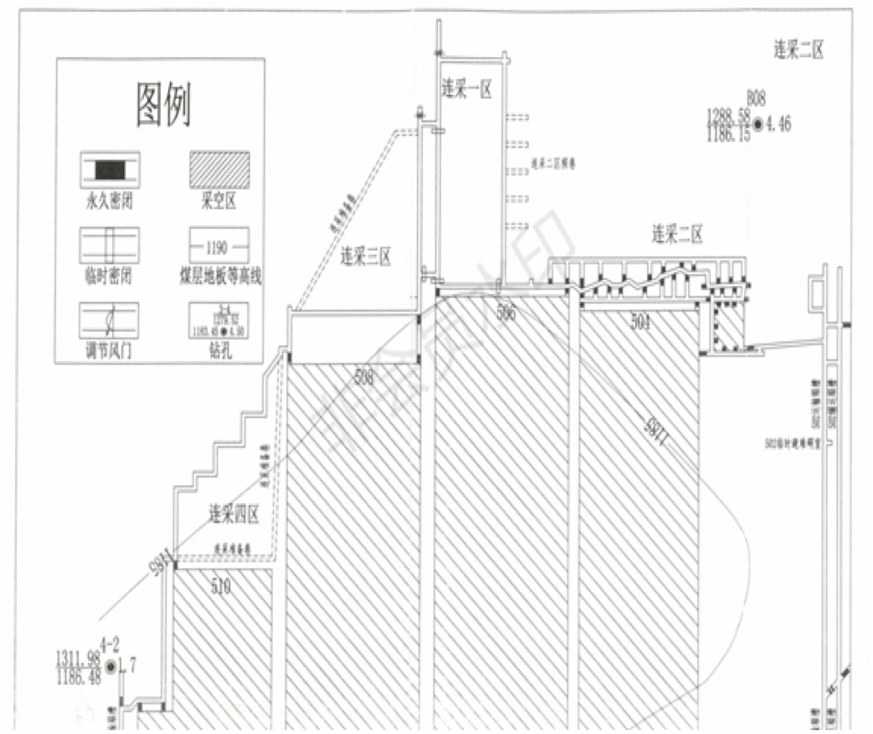 連采二區(qū)的開采,沒有單獨編制工作面設計和作業(yè)規(guī)程,《5-1煤南翼連續(xù)采煤機短壁回采一區(qū)作業(yè)規(guī)程》中也沒有包含開采連采二區(qū)的內(nèi)容。2018年12月初,連采隊從506進風順槽與二支巷交叉口處向西南掘進到11.4米時,與老空打通,采用紅磚壘砌臨時密閉封堵。2019年1月11日夜班,在二支巷回采了3個采硐后,從506進風順槽與三支巷交叉口處,垂直于506進風順槽向西南方向掘進至41.2米處。
