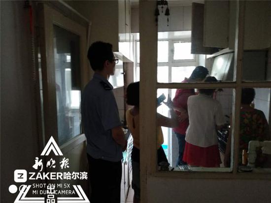 圖為事發(fā)現(xiàn)場(chǎng) 7 月 23 日 10 時(shí) 30 分許,斯大林派出所民警接到市民報(bào)警稱,在道里區(qū)尚志胡同 25 號(hào) 5 單元 4 樓的居民家中,有煤氣泄漏,十分危險(xiǎn),民警賈野等人立即出警。在現(xiàn)場(chǎng),燃?xì)夤镜墓ぷ魅藛T說(shuō),煤氣泄漏已經(jīng)達(dá)到爆炸標(biāo)準(zhǔn),需要立刻疏散居民。
