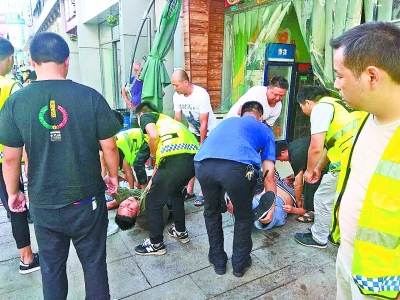此時,相鄰一家快餐店的老板娘雍女士正在倒垃圾,見狀趕緊喊來兩名伙計,和城管隊員們一起將店內(nèi)的一名白衣女子和一名綠衣男子,抬到店外陰涼通風(fēng)處。雍女士用手指猛掐白衣女子的人中,但始終沒有反應(yīng)。